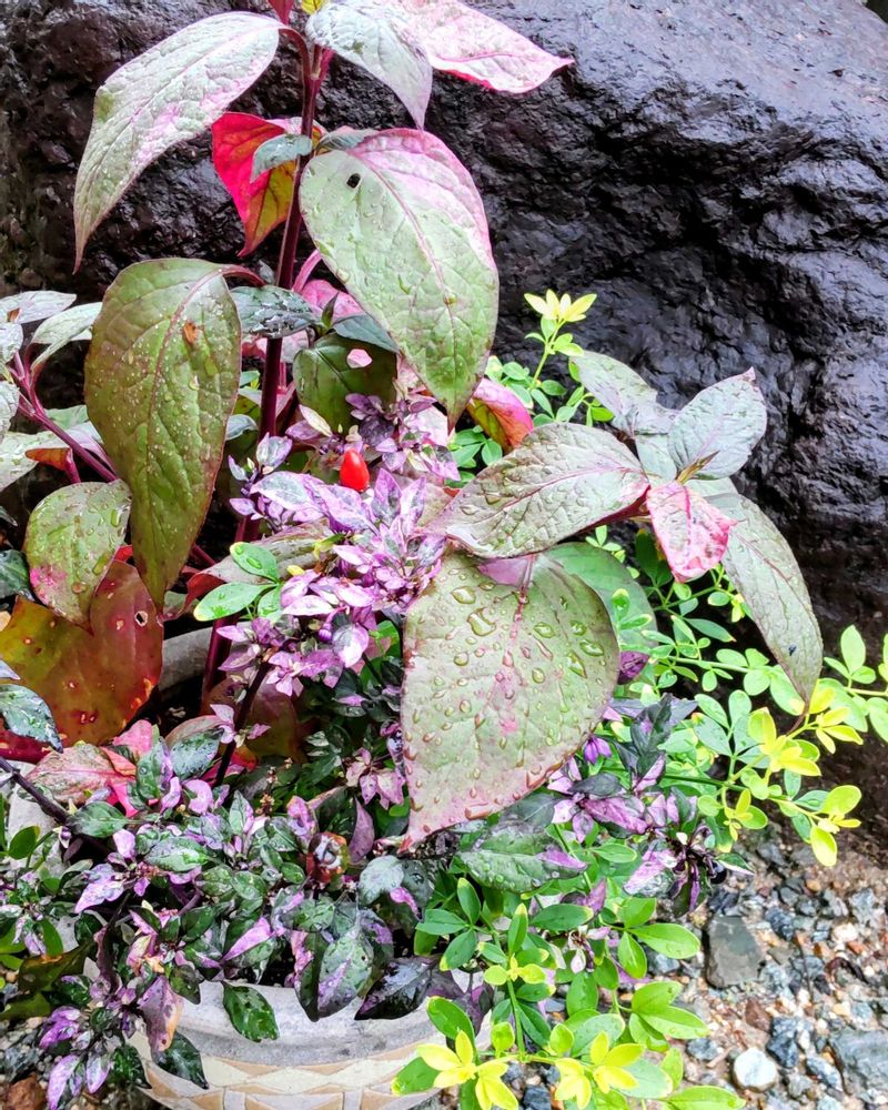 今夏、いつの零れ種からなのか ひょっこり出現したピンクの斑入り コタキナバル? アルテルナンテラ?を 庭からひっこ抜いて 寄せ植えに
