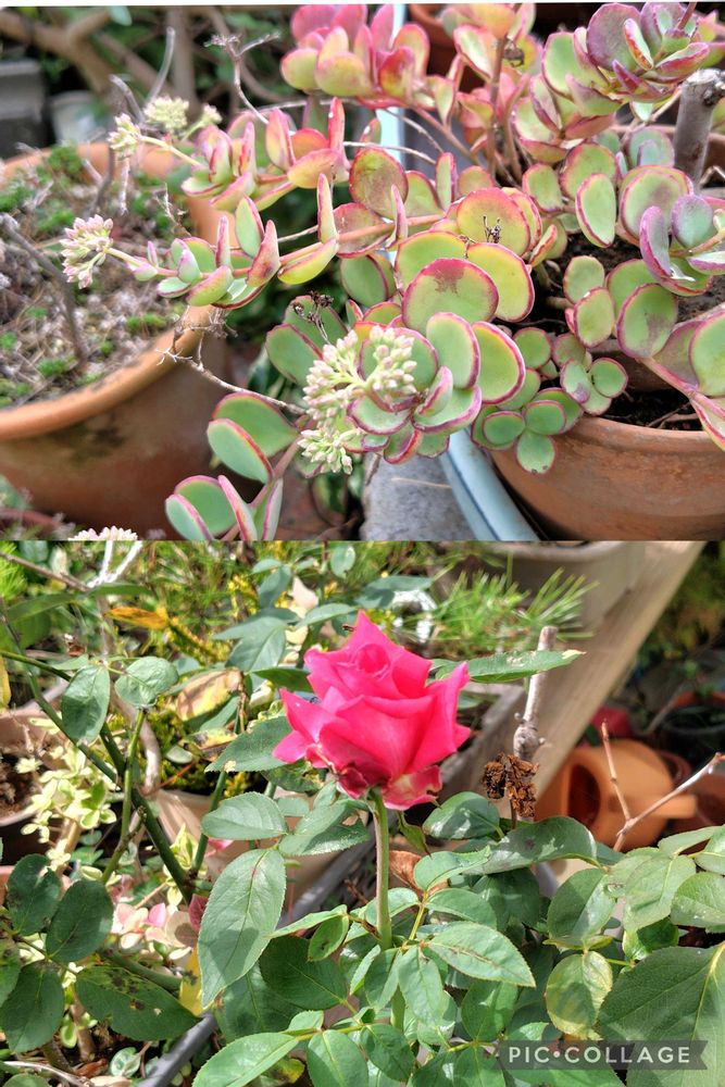 ①ミセバヤ に蕾ができています 四季咲きのバラ 一輪咲いてます