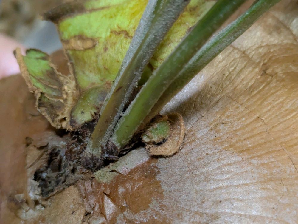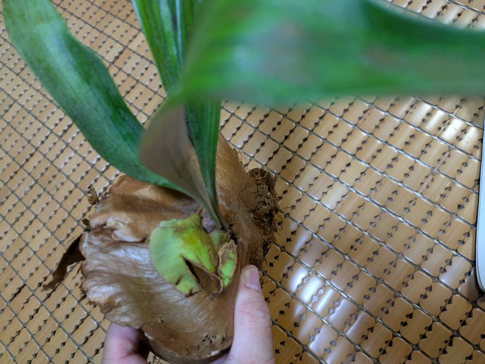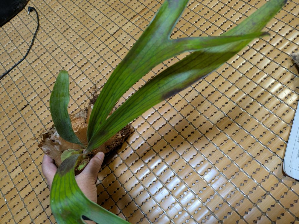 いいよいいよ持っていきな!って むんずと手前の割と大きな子株をむしり取ってくれた 品種は不明だけど立ち葉で凄く凛々しい 早々にいた付けしてみたよ むんずと掴んでむしり取ったため…出始めていた外套葉が傷んでしまったけど 成長点は元気 すぐに次の外套葉も出てきそうなのでこれからが楽しみ ヘゴの幹をカットしてもらってそれにつけた