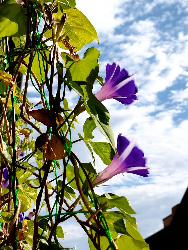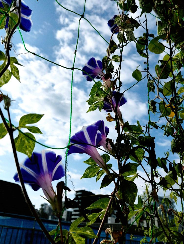 ネットの朝顔も、いい感じね。💙🤍💜🤍💙