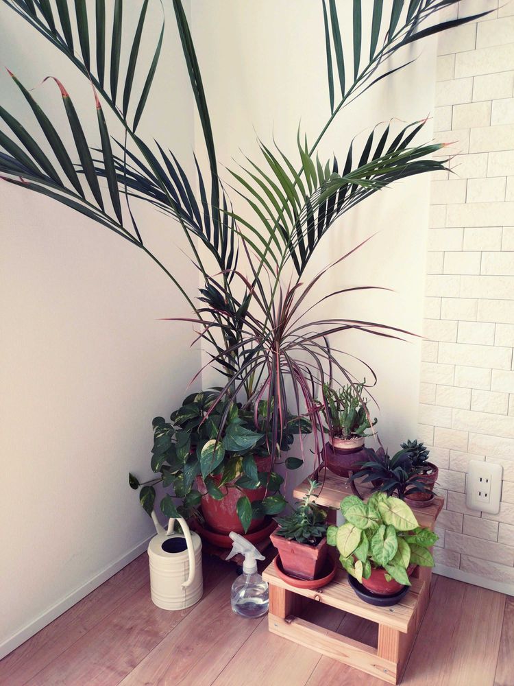 余りお世話出来ないので堅強なアレカヤシやコンシンネ、ポトスでリビングに緑のアクセント。