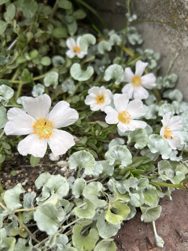 白花も可愛いなぁと思って迎えてどこに植えるか?陽当たり、乾燥地…考えたらここ?ディコンドラをバリバリ剥がして植えるしか無いって穴を掘って植えてみたらいい感じになりました🤣