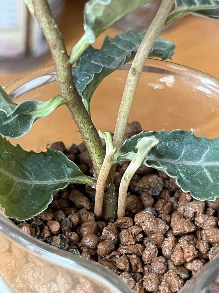 前回、親株から3本の新芽が出たと投稿したのですがあれから1本がそこそこ成長して良い葉模様を出し始めました😁