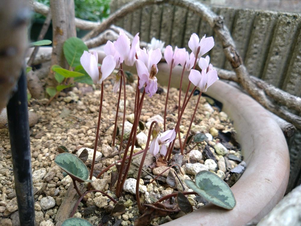スモークツリーの鉢に植えている原種シクラメン インタミナタム。