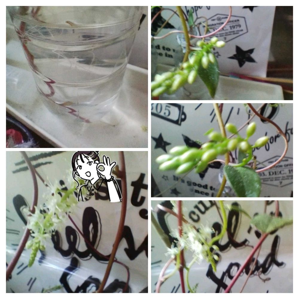 ③ 我が家の洗面所にペットボトル水栽培中オカワカメの切り花は茎から根っこ出てて蕾から開花してます。