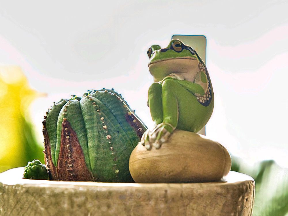 物憂げに膝を抱くカエルを慰めるかのように、優しく育つ姿に癒されます。