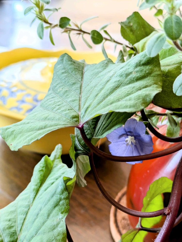 某お店のママさんから、飾るのに良いわよ〜と、伸びたサツマイモの枝葉をいただきました。