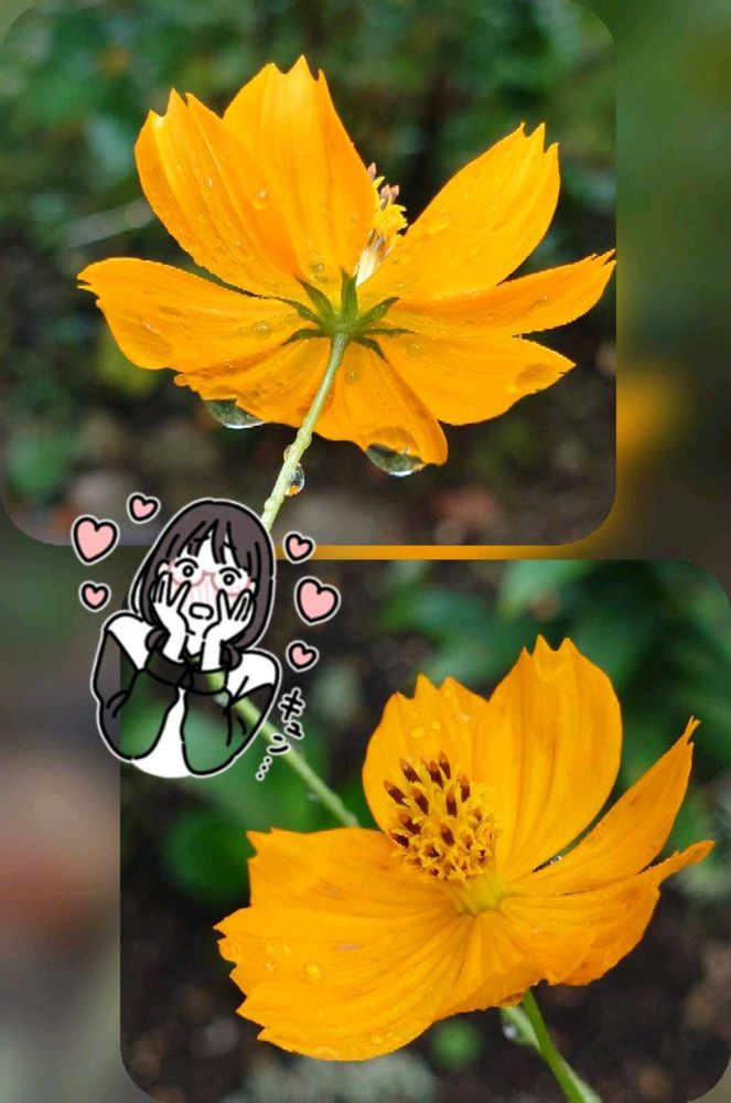 ① 我が家の裏庭のキバナコスモスが去年のこぼれ種から咲いてくれて💛