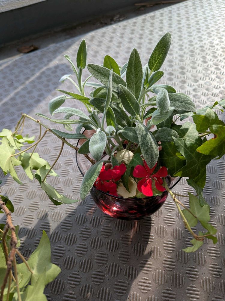 ベランダで爆発しているアイビー、セージ、ゼラニウム。