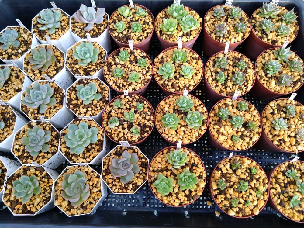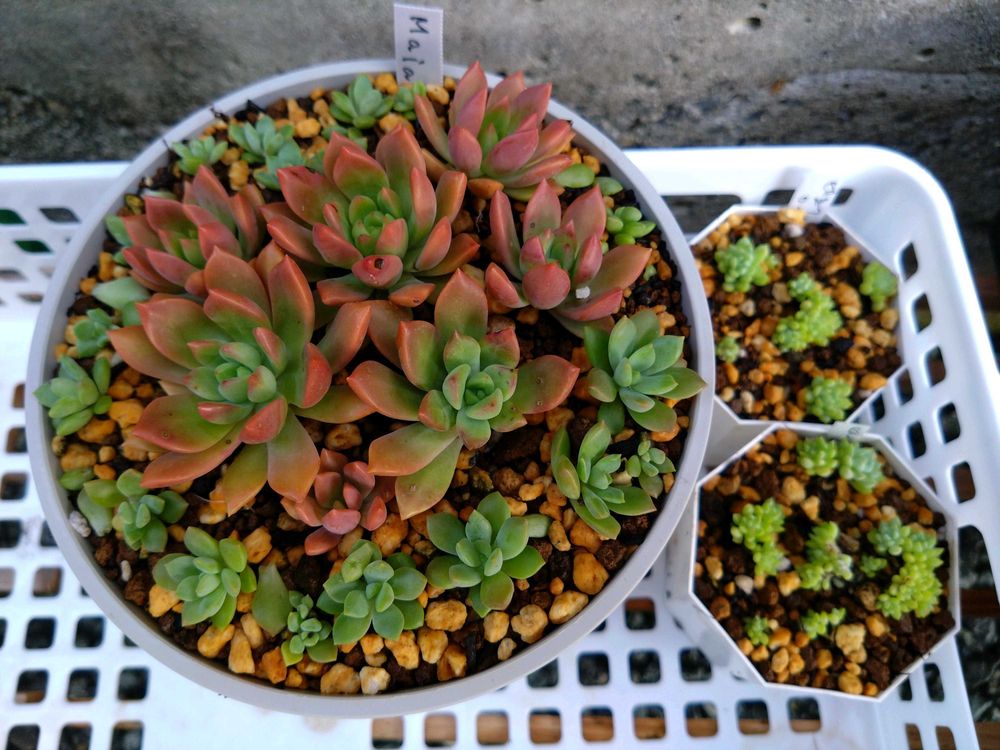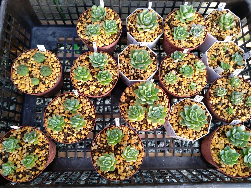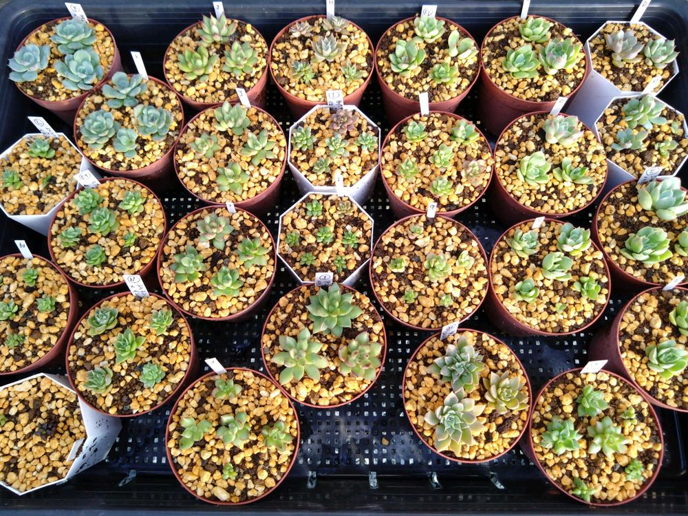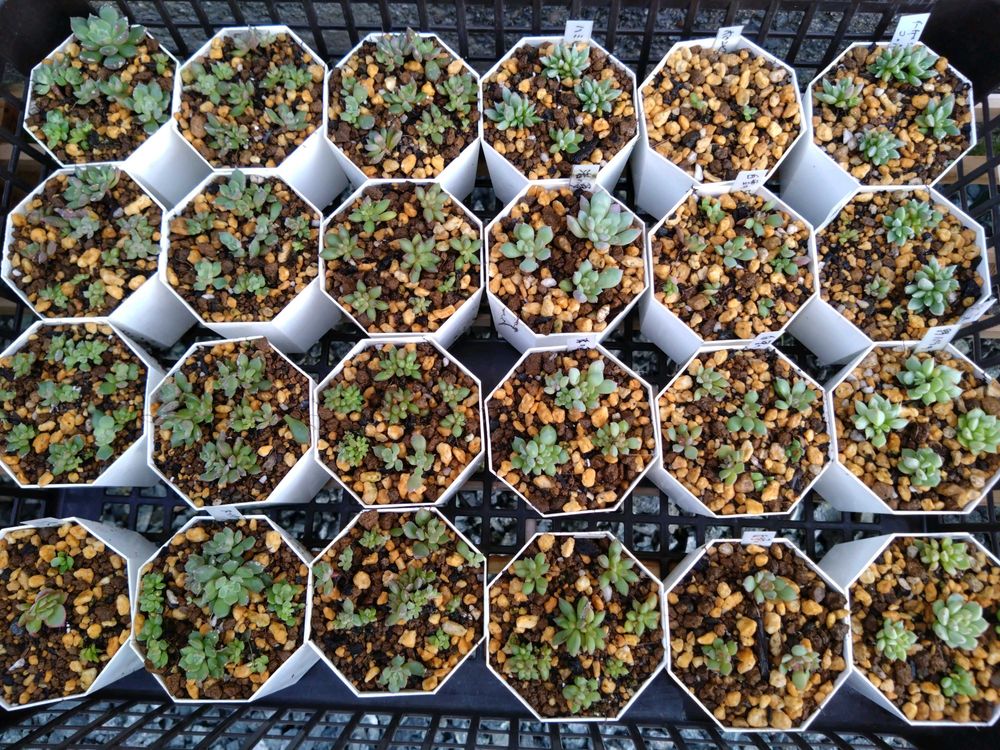 めちゃくちゃ暑くて全然成長してなかった葉挿しっ子達と24年のオリジナル交配実生苗達😂