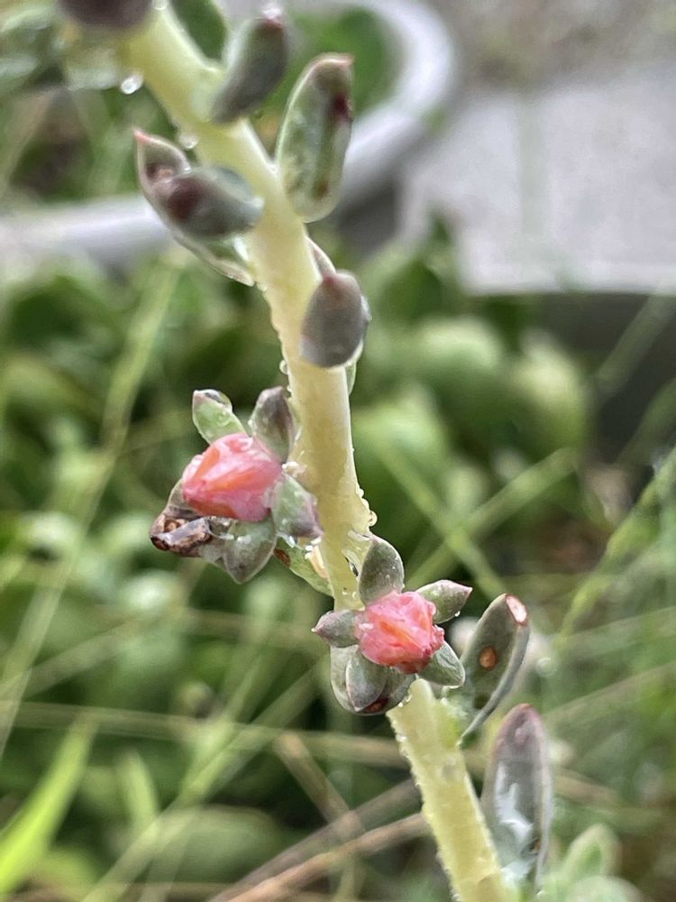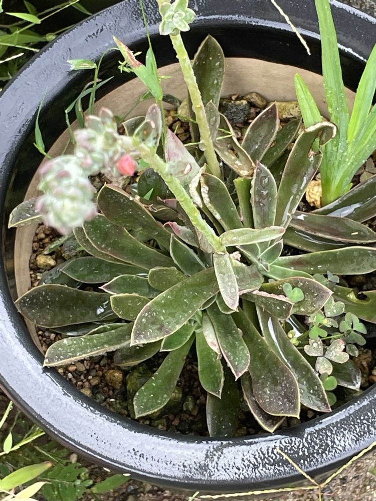 エケベリア属○○○?ここまでしかわかりませんね。多肉なんだけど、葉はそんなに厚くないです。黒法師と言う品種かも?😅黒法師はアエオニウム属だから違いますね🥴