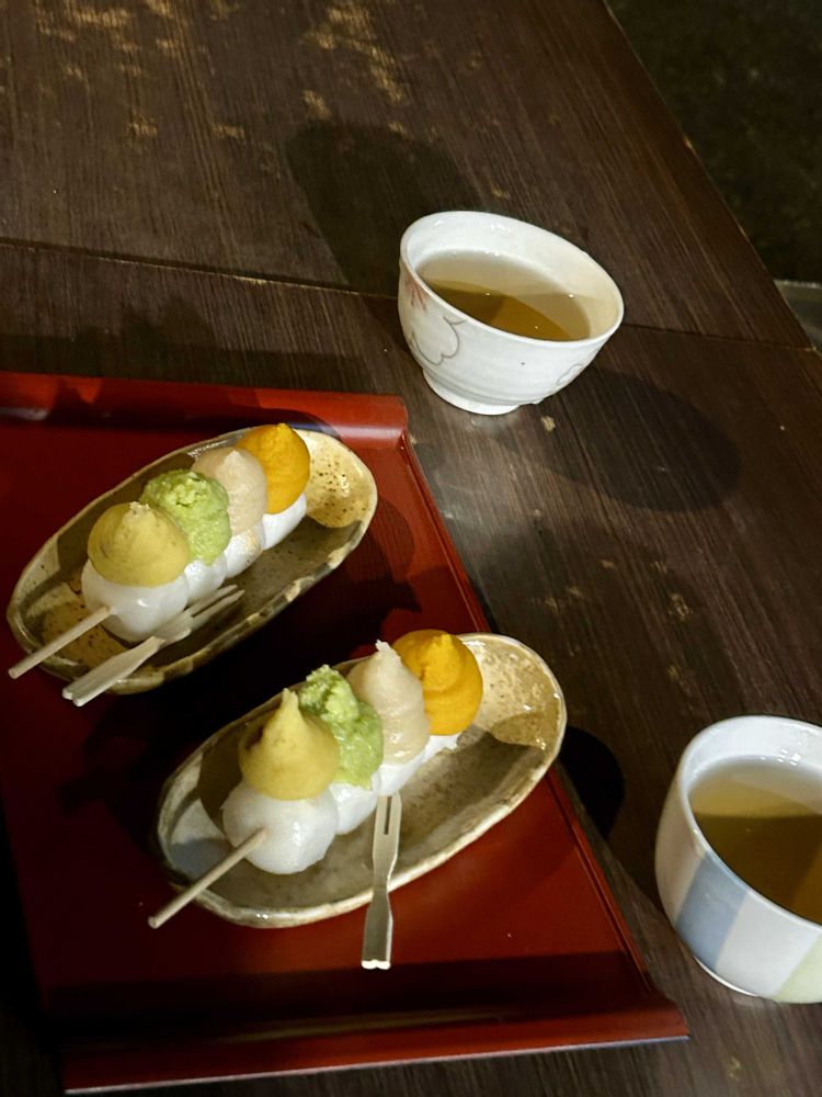 かぼちゃ栗ずんださつまいもの4色のいろどりだんごは柔らかくそれぞれの餡の粒感もありほっこり🍡😋