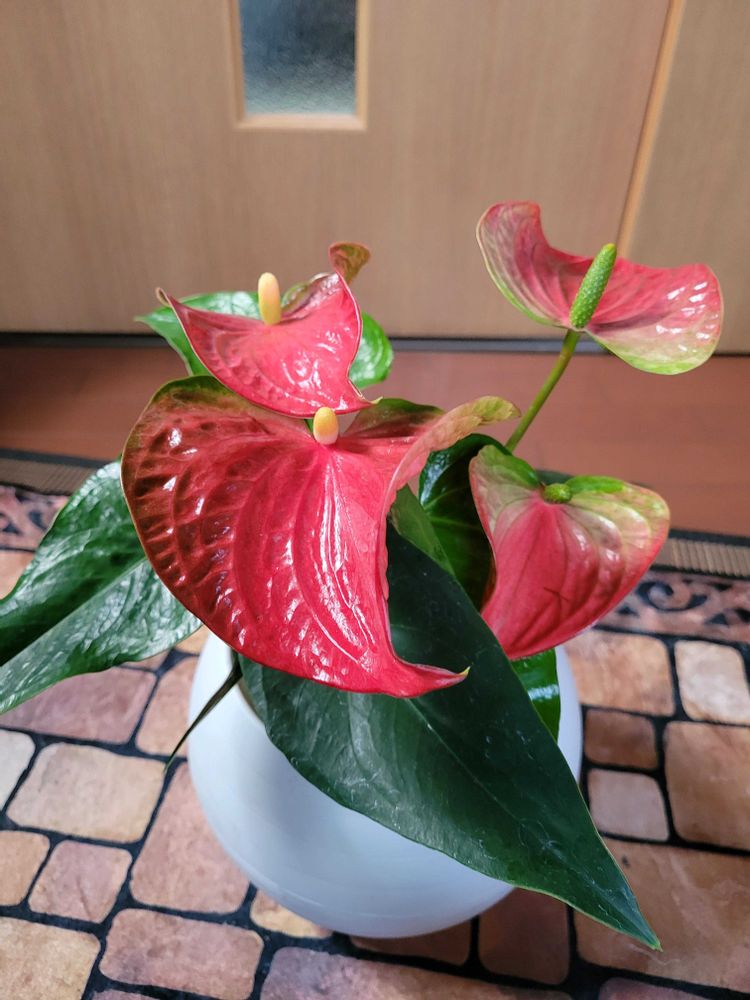 大きい立派なアンスリウムお値段が〜ꉂ🤭可愛い小さなお得なポット苗家の受け鉢の中に素敵に見えて良かった😍ꉂ🤣𐤔