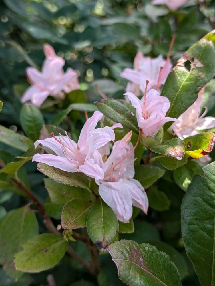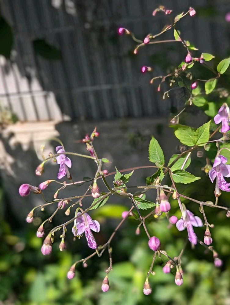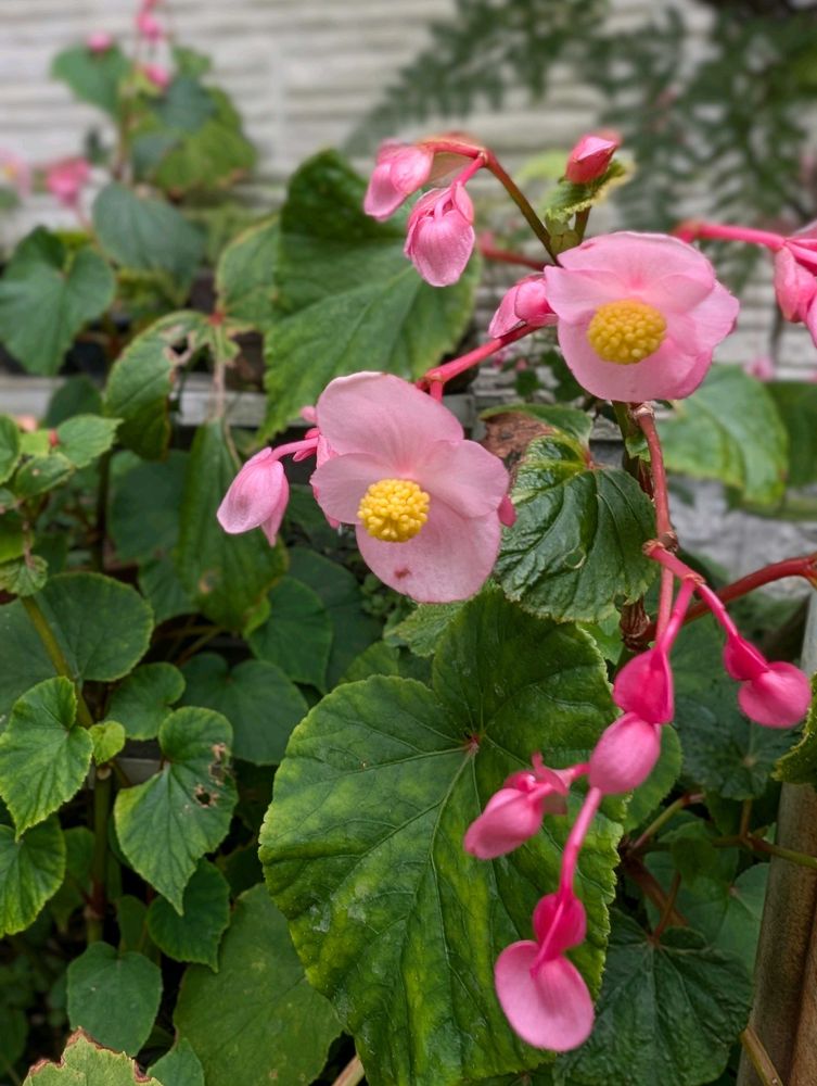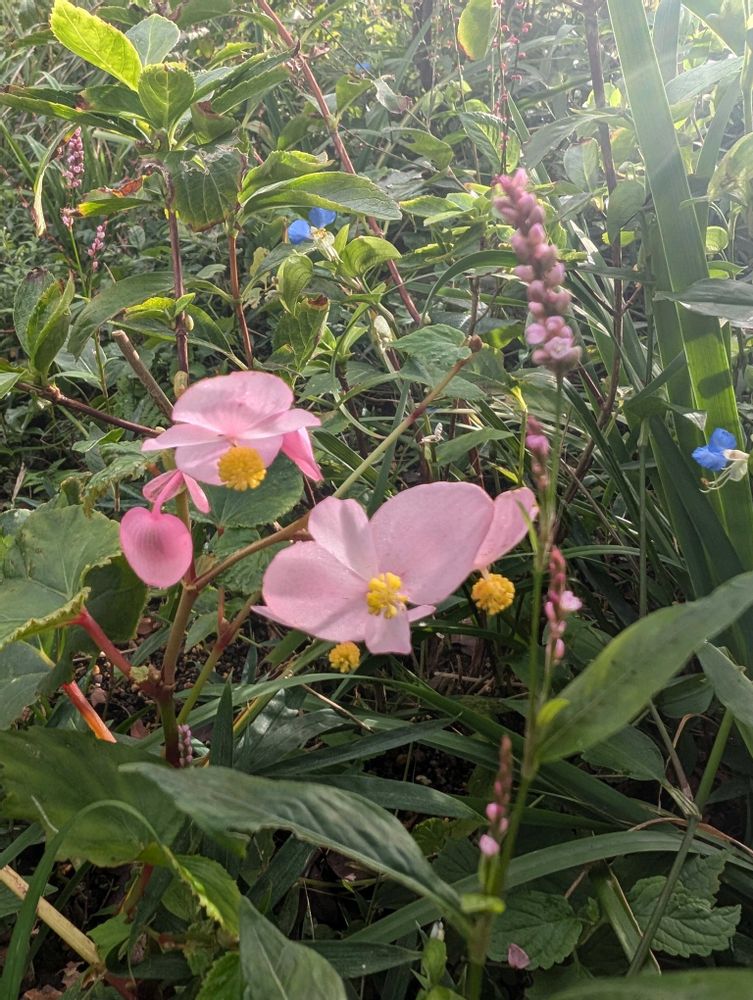 ①②シュウカイドウ③桃色カリガネソウ④草取りしたら出てきたツルボ⑤ニオイツツジが秋に咲いてしまった