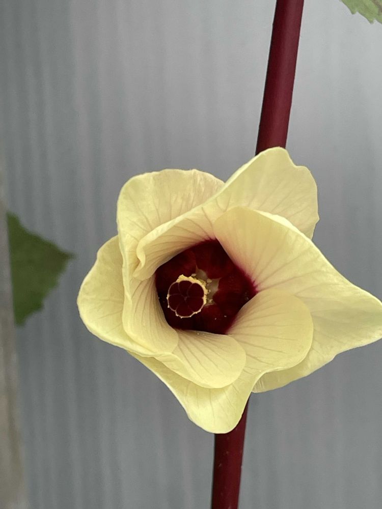 むらさきオクラの花がやっと咲きました。1個は中身だけ出ちゃって咲かないし、2個目は筒状で終わるし。