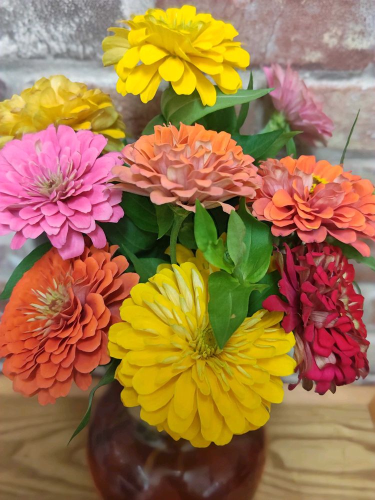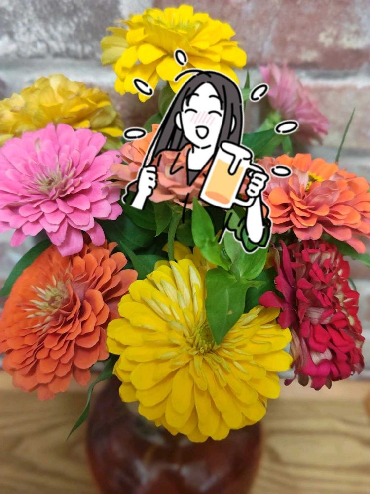 お疲れ様のお土産に、植え替え前の花壇から、ジニアの花束💐。色とりどりで部屋が明るくなりました。