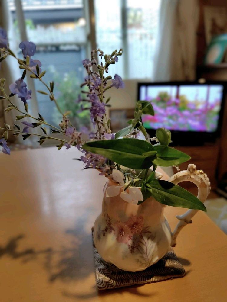 母から譲り受けた花瓶に、剪定したサルビア ウルギノーサ🌿ロシアンセージ🌿ツユクサ🩵💙ガウラ🤍🌿を…✨