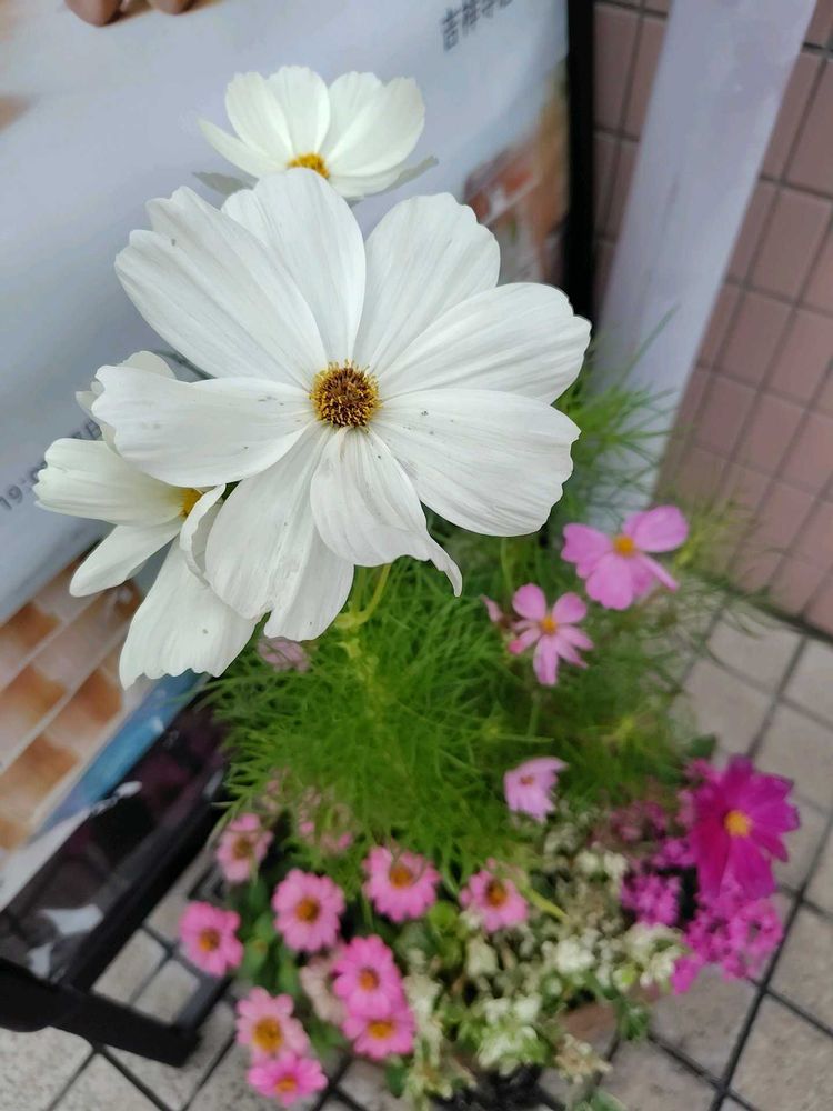 最近は、一つの株に複数色のものも出回っていますが、とても清楚でシンプルなコスモスとの寄せ植えでした🥰