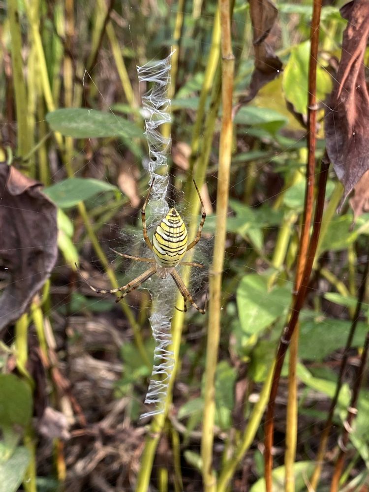 子どもの頃、大きな蜘蛛と言えばこれでした。雑木林が近くの遊び場だったので、やたらと見ていましたね。小さい虫をたくさん捕まえてくれる益虫というイメージですが、色が毒々しいので怖いと思う人も多いのかもしれません。