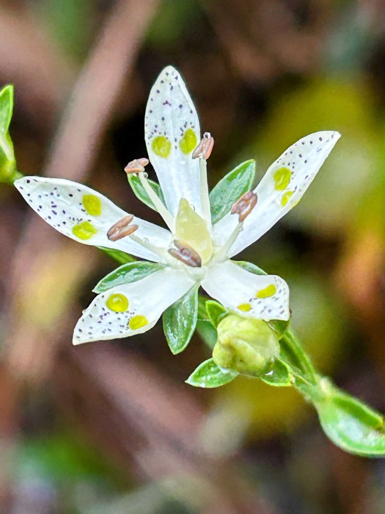 他のセンブリの蜜腺は花冠の根元付近に多く、アケボノソウは花弁の外側近くにあり、その色と暗紫色の斑点が、より花を美しく際立たせています