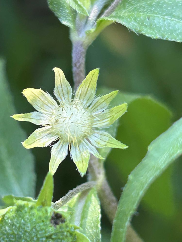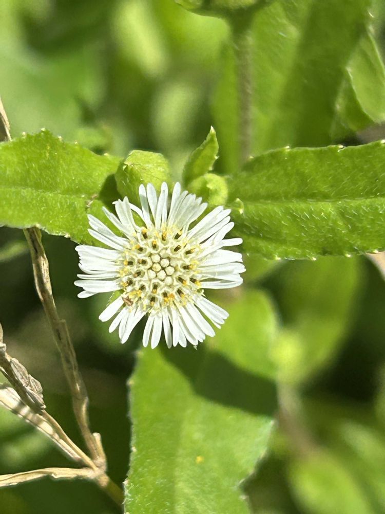 1️⃣花 直径1cmで周りに白色の舌状花が2列に並び、内側に緑白色の筒状花がつく