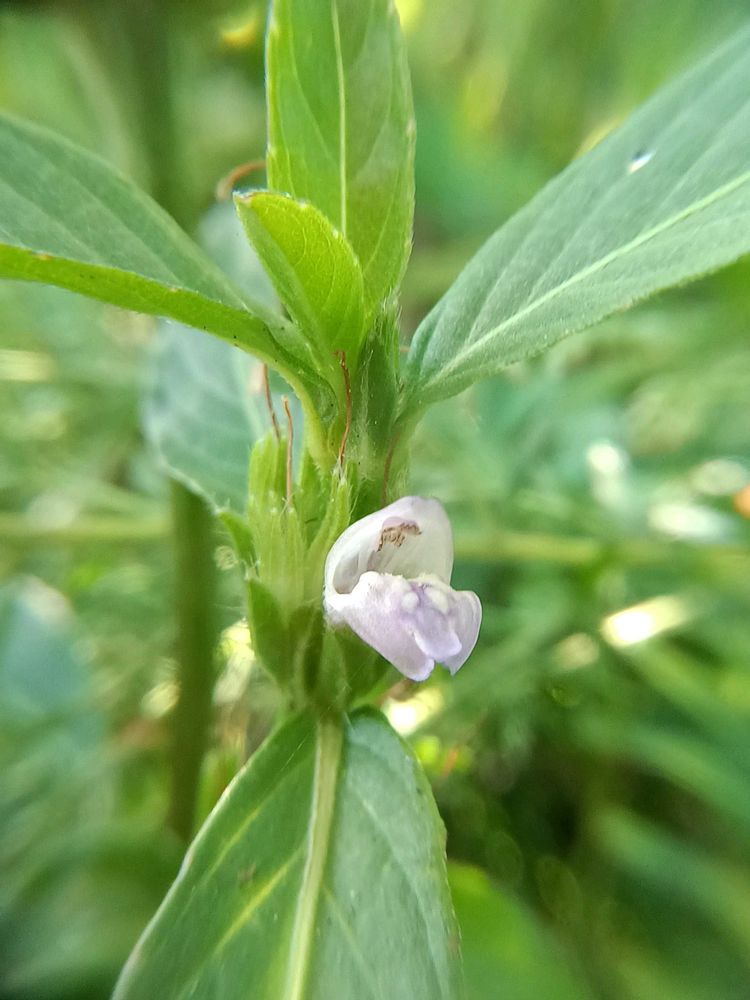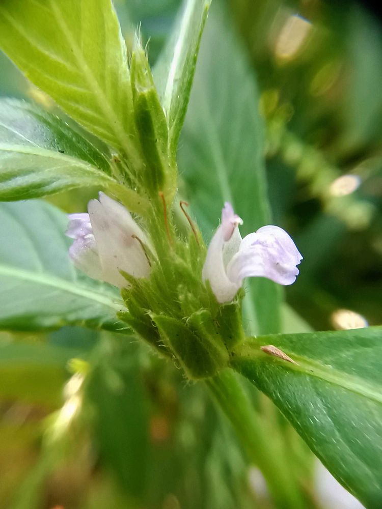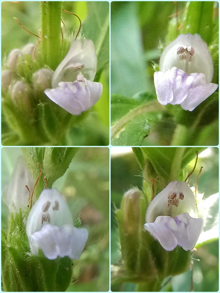 花は葉腋に複数付き、唇形花で花冠長さ1-1.3cm、花柄はありません。