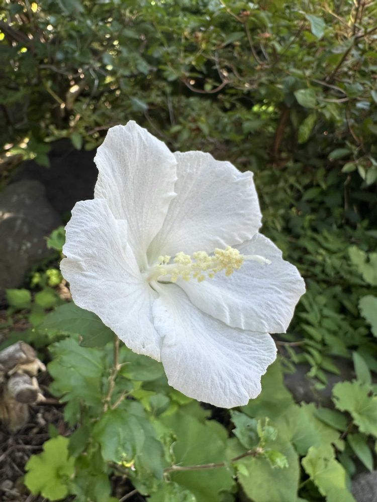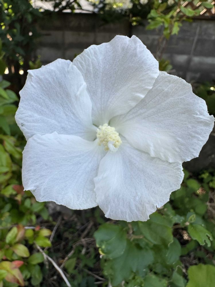 庭にポツンと一輪の白いムクゲ。我が家にはピンクのムクゲはたくさん咲いているけど白いのは初めて😳