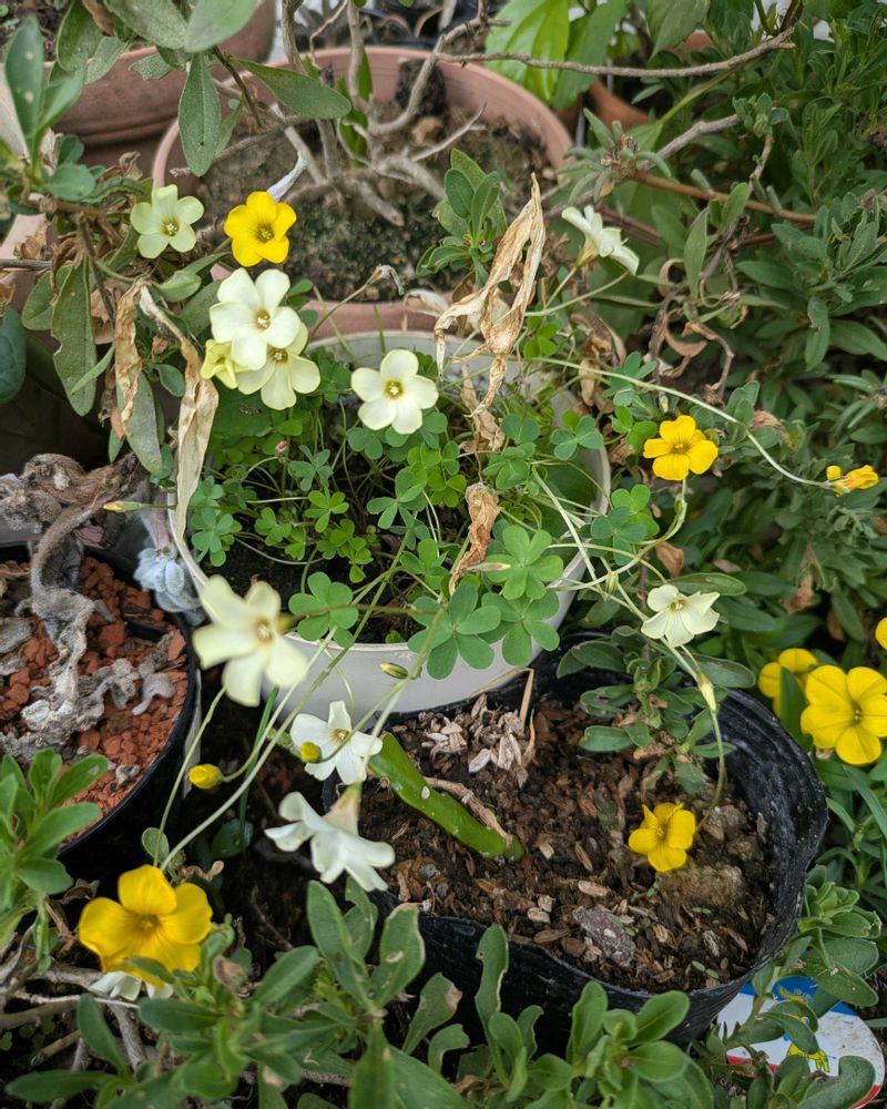 オキザリスは、植え替えのタイミングわからず、あちこち発芽したり、咲いてきています。