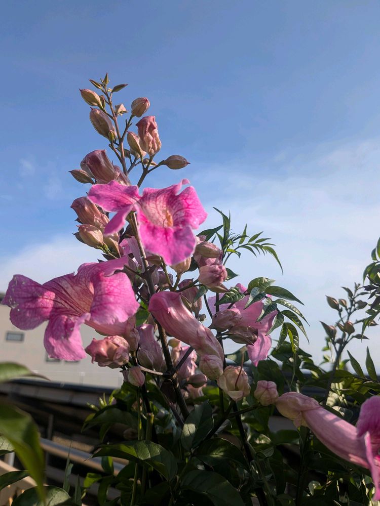 ①②去年は鉢植えてヒョロヒョロてポツリとしか咲かなかったピンクのノウゼンカズラ ピーチプリマドンナ🩷 地植えにしたら大暴れ😂 えらいこっちゃ~とあーちにゆるく留め付けてたら、ポキッと折れました😅 折れやすいのかぁ〜まぁ沢山咲きそうだから良しとします😅