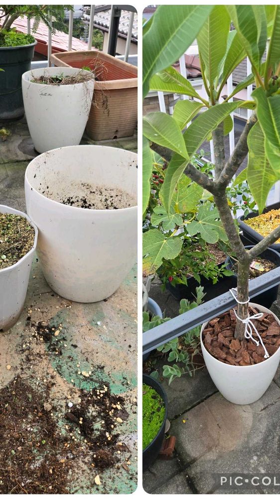 この日 蝋梅とプルメリアと羽衣ジャスミンの鉢増しをしてみました。
