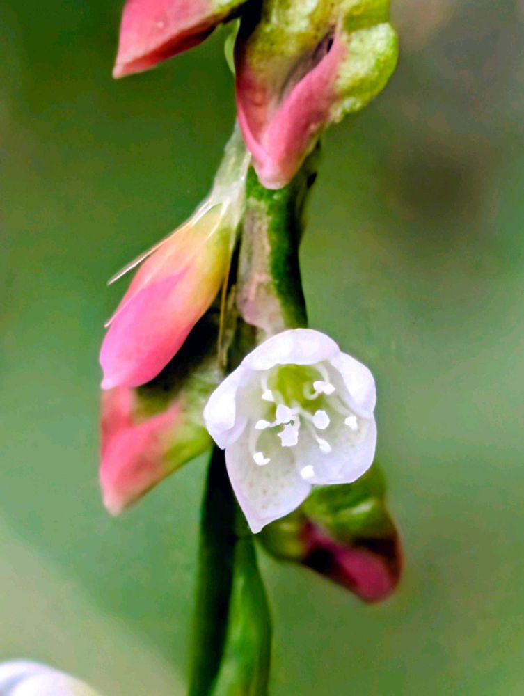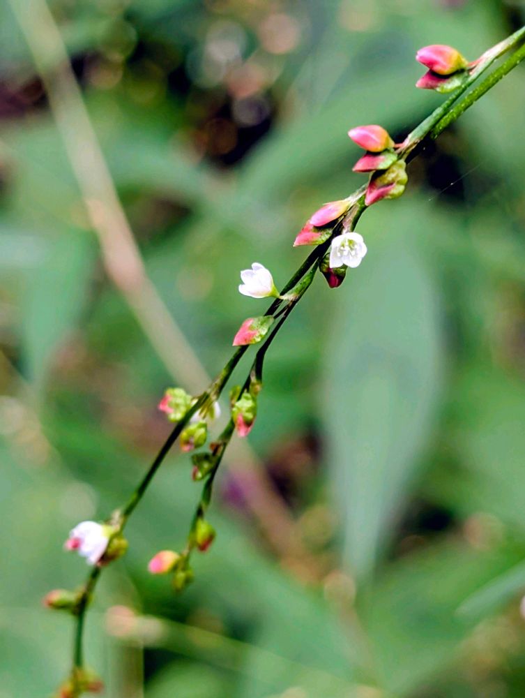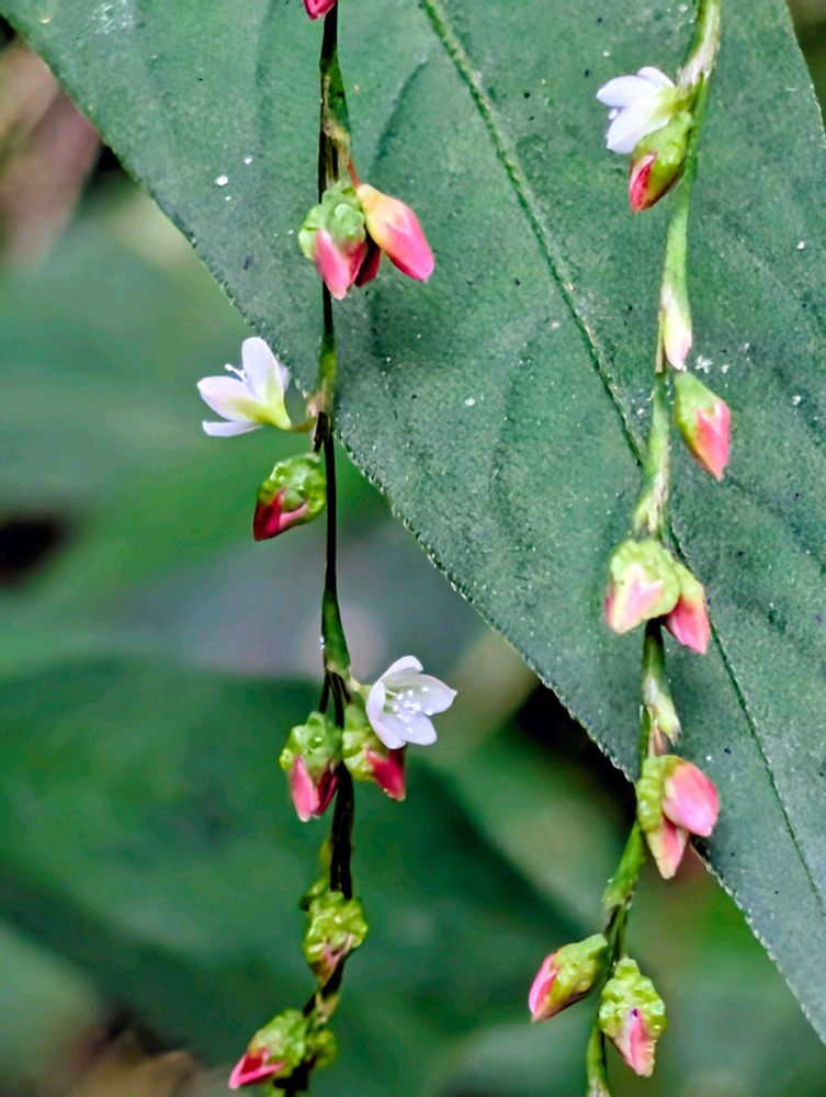 花序は頂生または腋生、紐状の穂状花序状、先が垂れ下がり、長さ7〜15cm、淡紅色の小さな花をまばらにつけ、下部では途切れる。