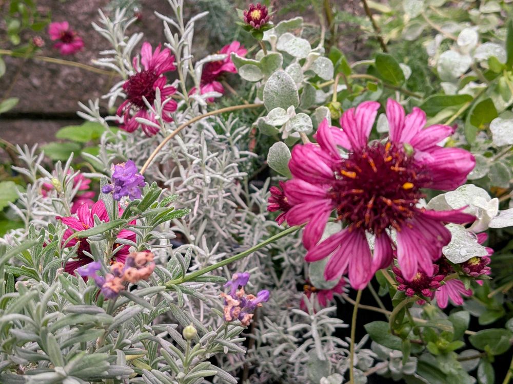 今庭🏡ヘリクリサムシルバーの葉とラベンダーの葉。ガイラルディアグレープセンセーション。写真とるとかわいいですが、全体みると暴れ放題です。