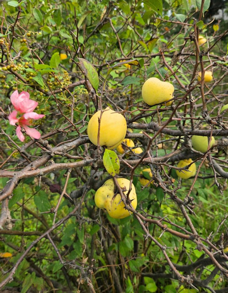 いつも通る散歩道で、大きな黄色い実を付けた木を見つけました。カリンにしては実が少し小さめで、木の幹が少し違うかなと思っていたので、もしかしたらボケかな?と、この投稿を見て思いました。