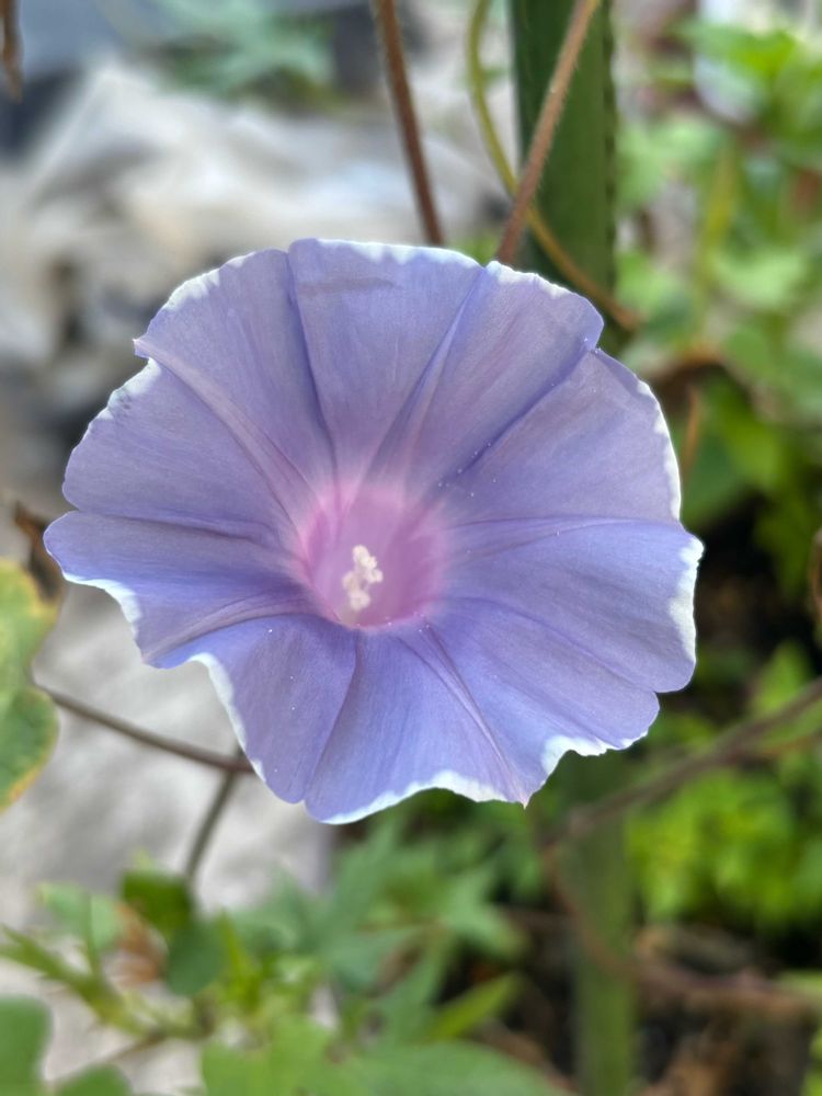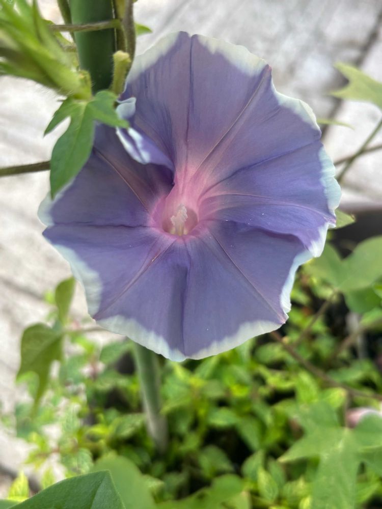 この朝顔は、今年、別の品種の色合いの朝顔の種を蒔いたのに、突然変異して咲いた薄墨色だけど、涼しくなってきたら、少し色合いがブルーグレイになってきてる。