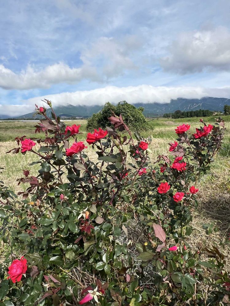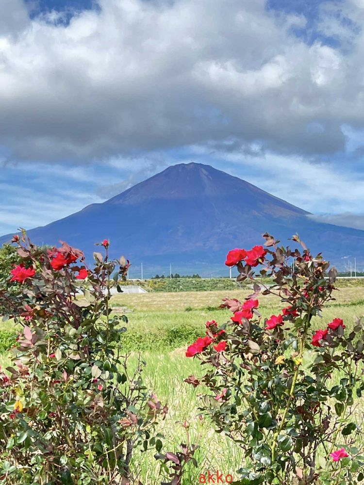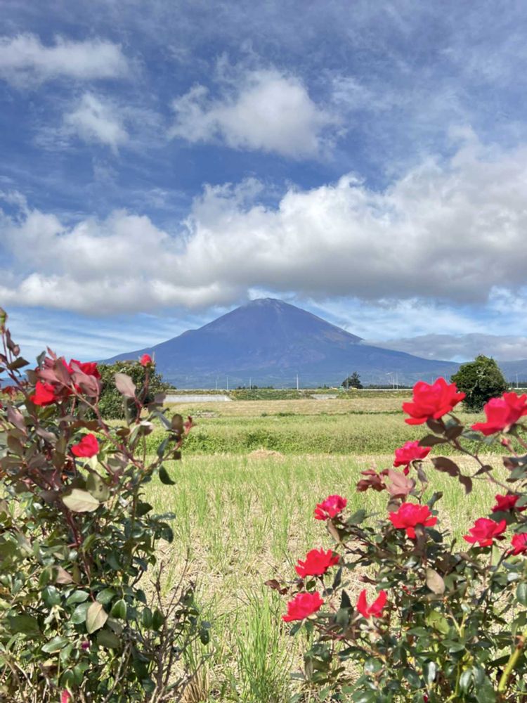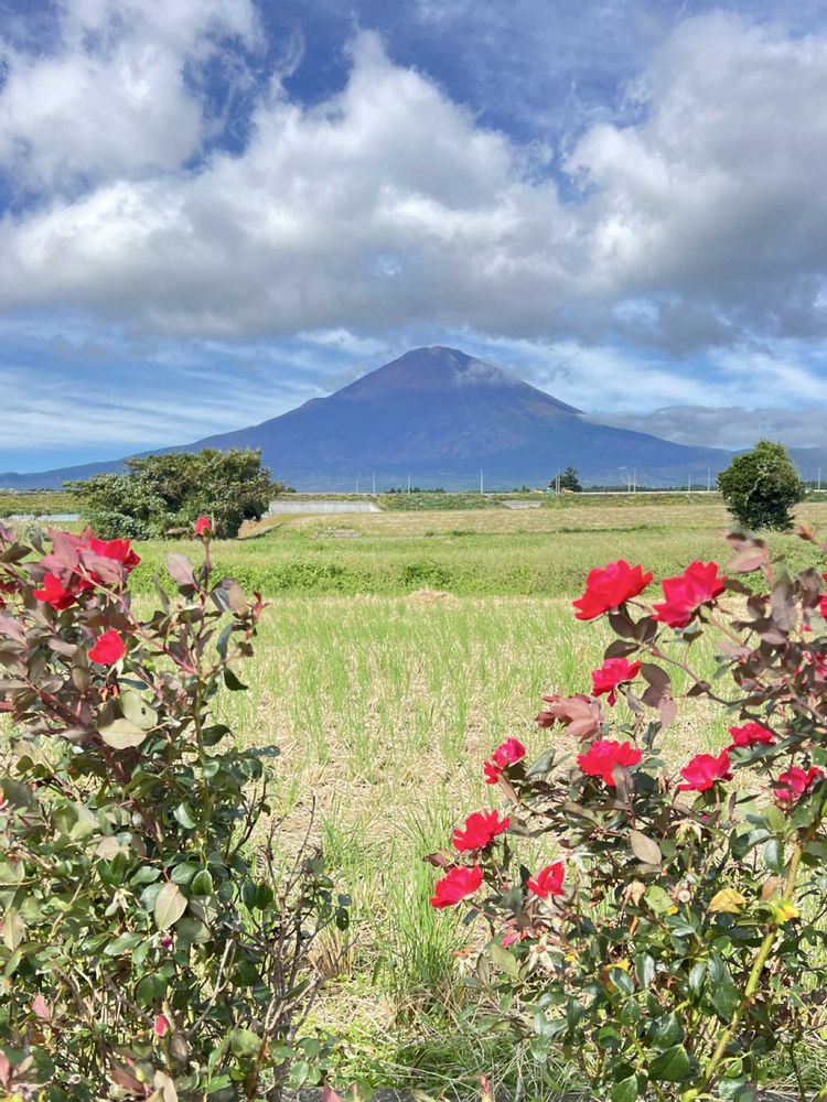 富士山がよく見える場所の田んぼの土手に地主さんが植えた赤いバラ🌹が、