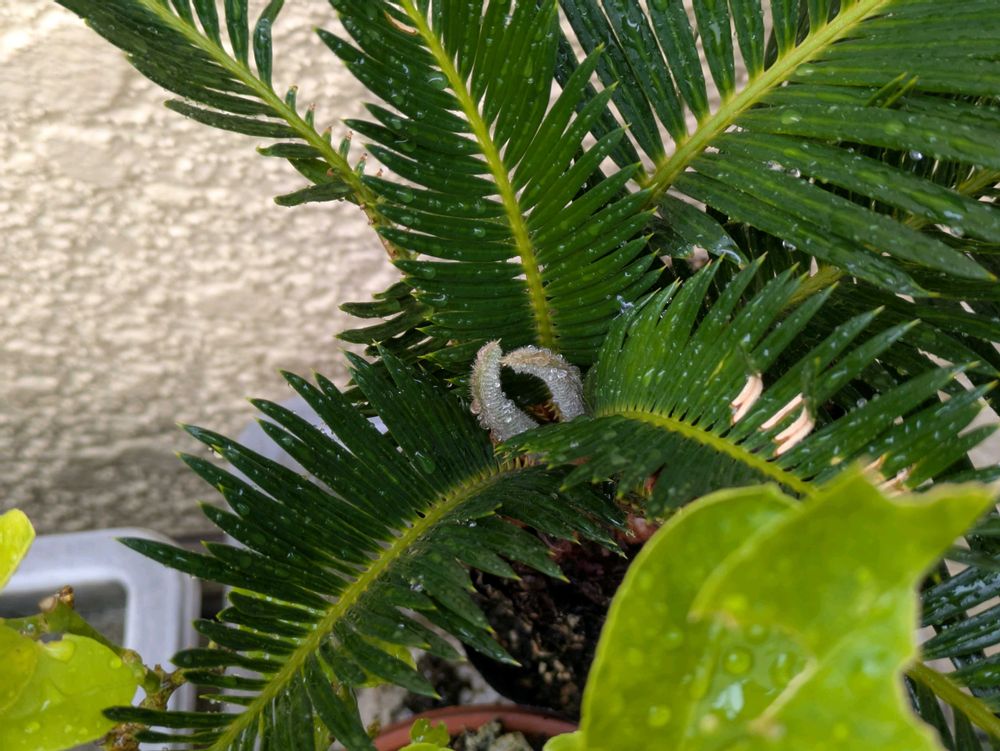 この間、今年2回目の葉が出てきたと投稿しましたが、新たに別の鉢のソテツから葉が出てきました。