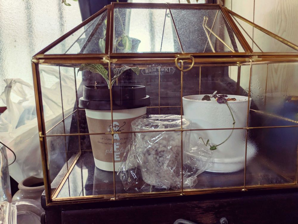 室内は1日エアコンついてて乾燥するので前にに譲ってもらったハートカズラと一緒にガラスケースにて保湿