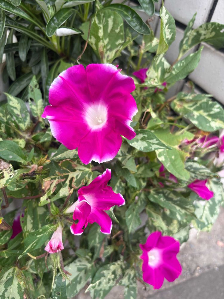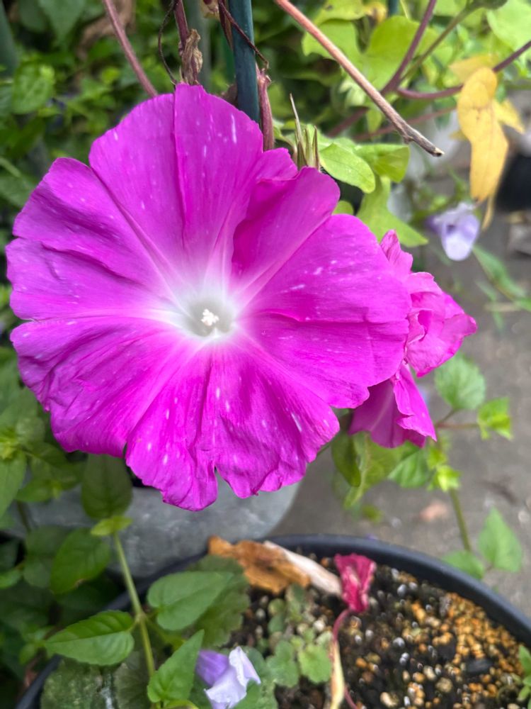 朝顔も変化しながら咲き進むようで、白い点々が入ってる。
