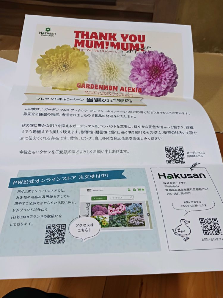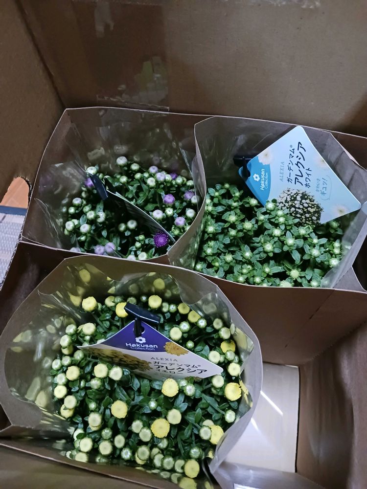 今日の夕方、ハクサンさんからガーデンマムのプレゼントが届きました。嬉しいです。大切にそだてます😊