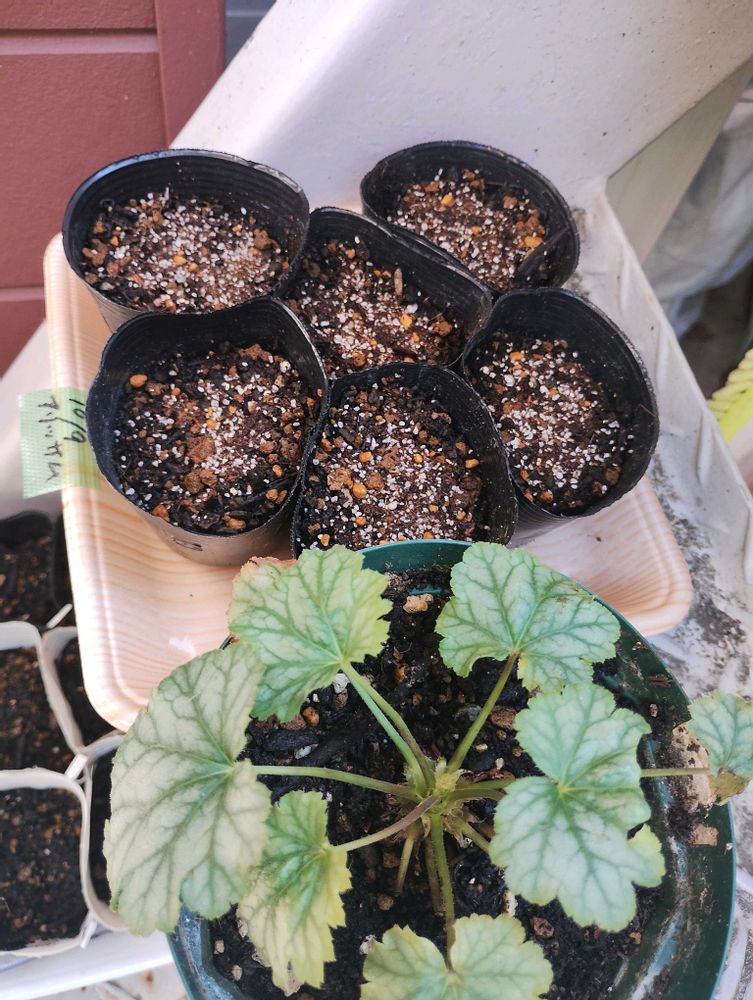 ◯ワサビ茎が伸び伸びだったヒューケラパリの植え替えと挿し芽