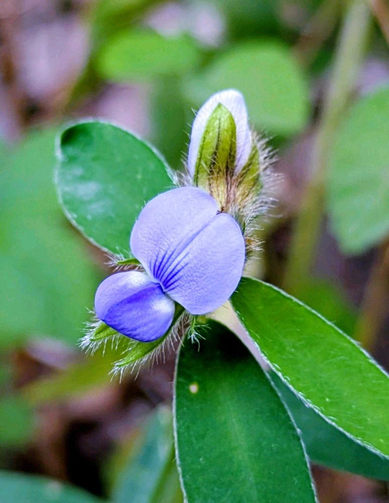 タヌキ豆のお花の周りには茶色い毛に覆われているけど 中心の青い💙お花がとても素敵ですね🩷