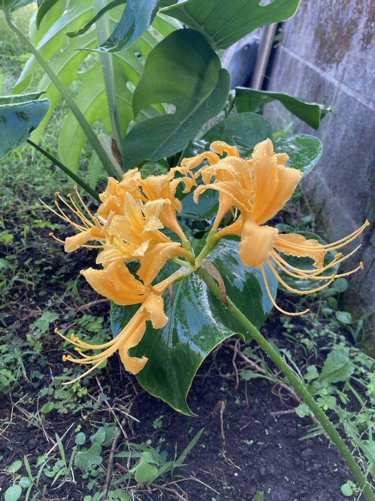 モンステラの後ろの超日陰の場所で黄色の彼岸花が咲きました。