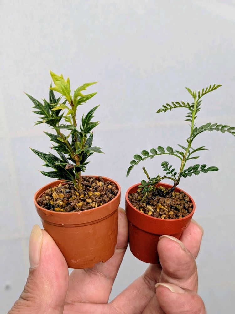 燕尾ヒイラギと磯ザンショウ、ミニミニ苗木。冬前のラストスパートの新芽🌱
