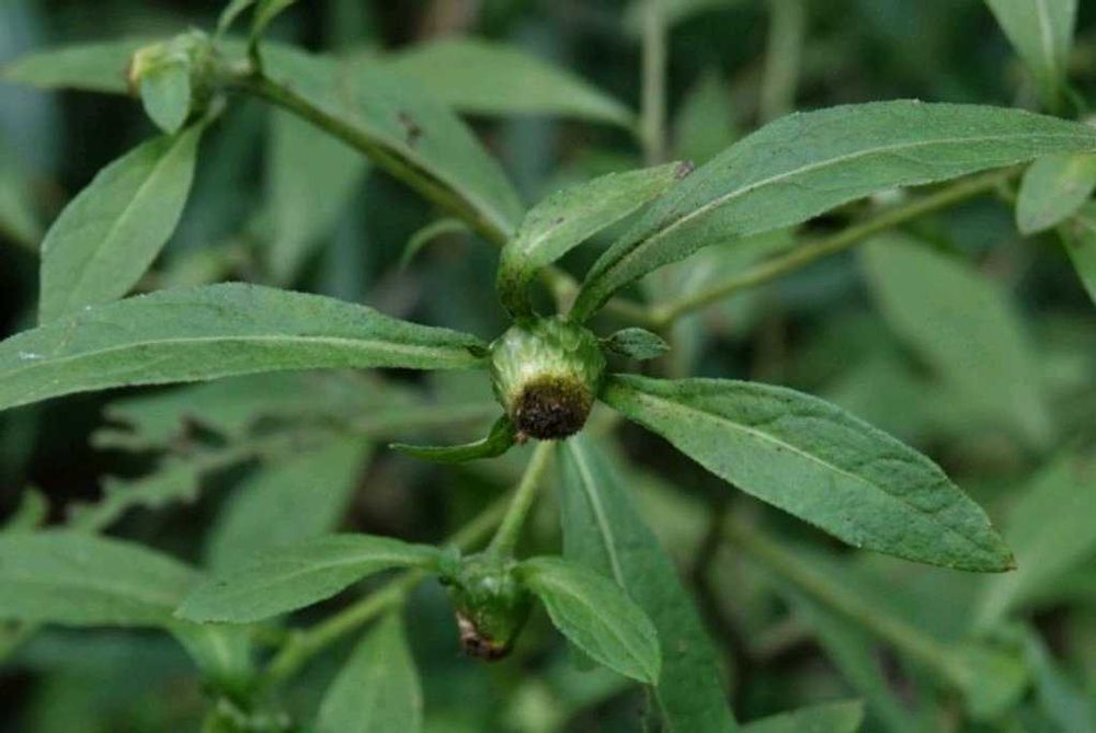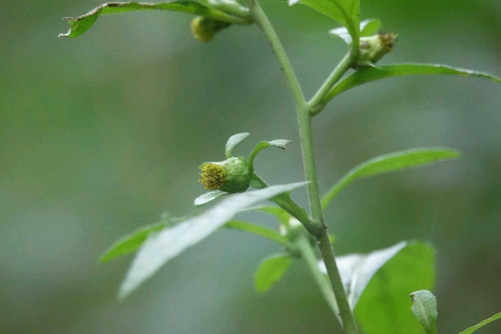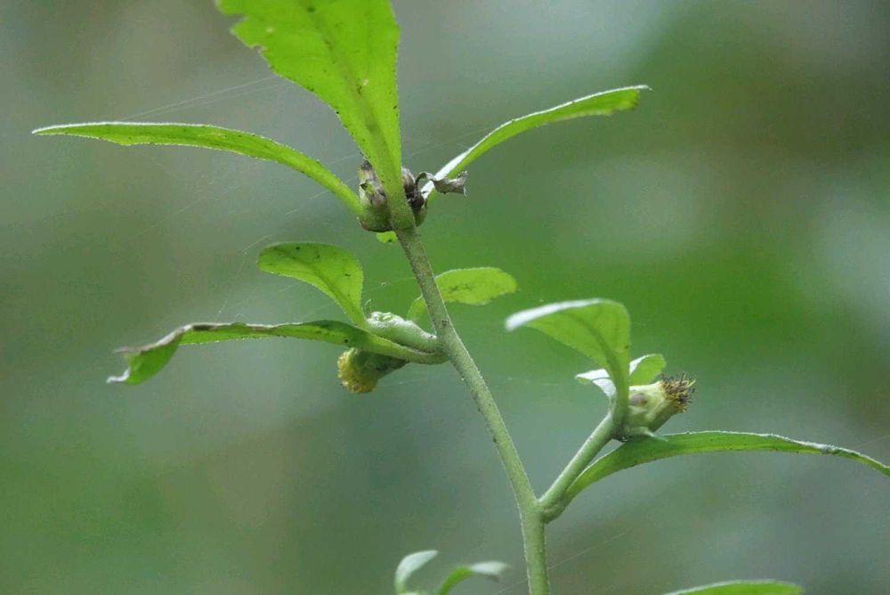 茎が太く軟毛あり、高さ0.5〜1㍍で成長が止まり上部から数本の長い横枝を放射状にのばす。葉腋に黄色の頭花を下向きに1個ずつ付ける。頭花は約1㌢くらい。殆ど柄がない。