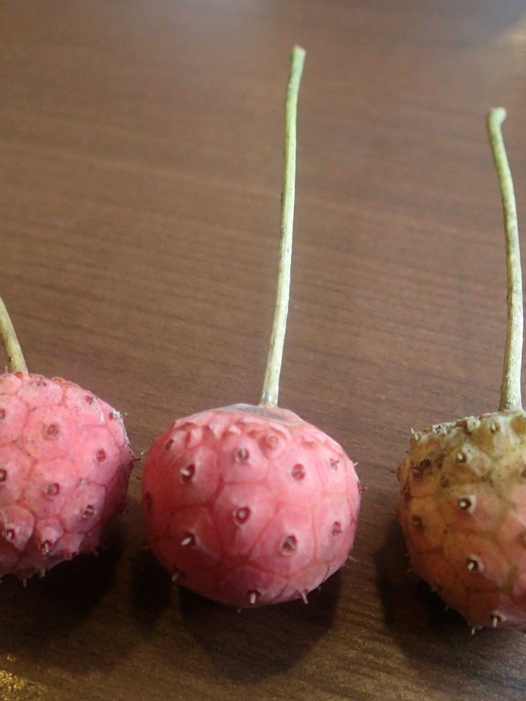 知人の庭でヤマボウシの実が赤く実っていました。頂き皮を剥いて食すると甘くねっとりとした食感です。ただ種が多いのが難点かな?加工してジャムなどには出来ないでしょうか?🤗