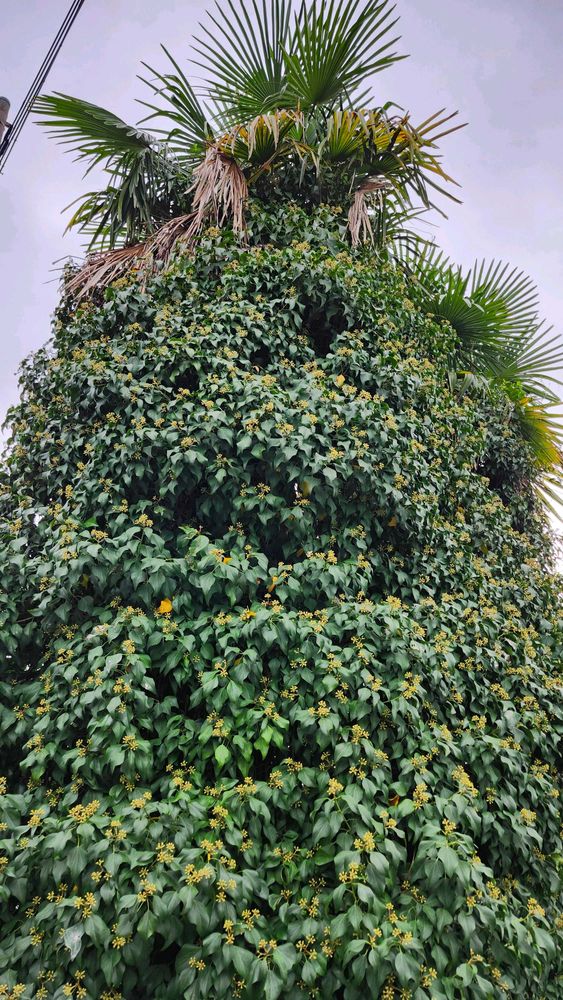 キヅタがシュロノキを覆い被さるように延びていました。
