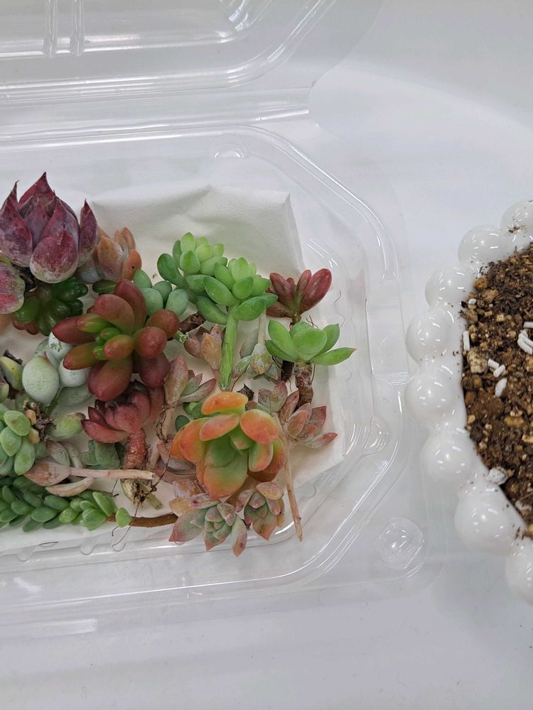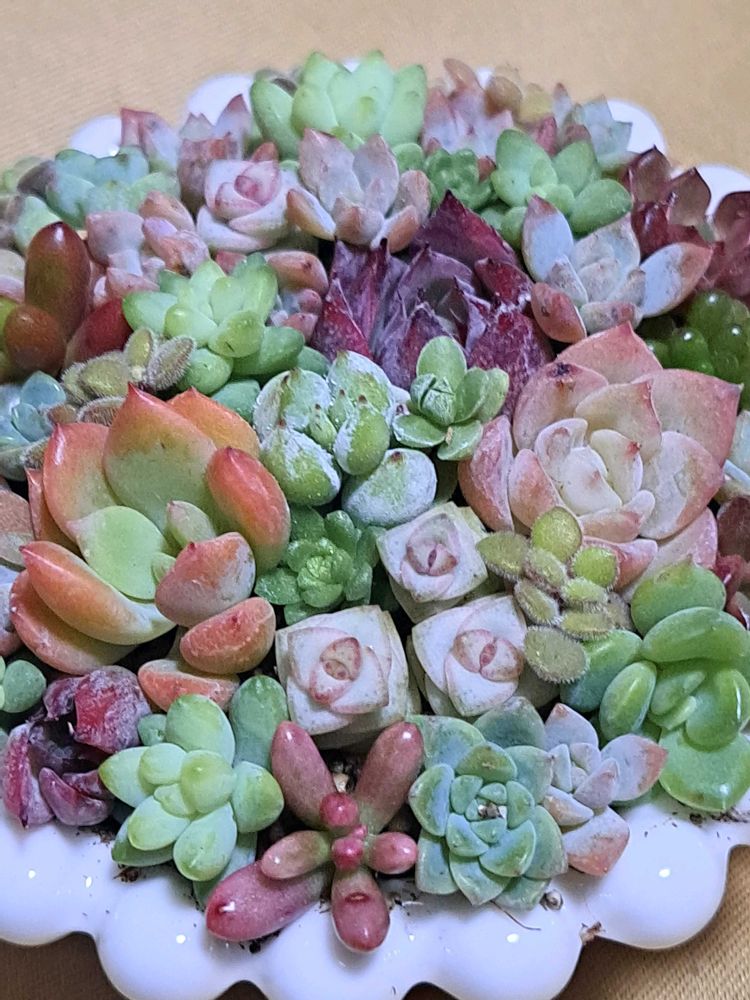 ちびちびちゃんたち、名前も種類もわかんなくって、、、でもどれもかわいい 特に、3つ固めて植えた、白っぽい四角っぽいのが気に入ってます
