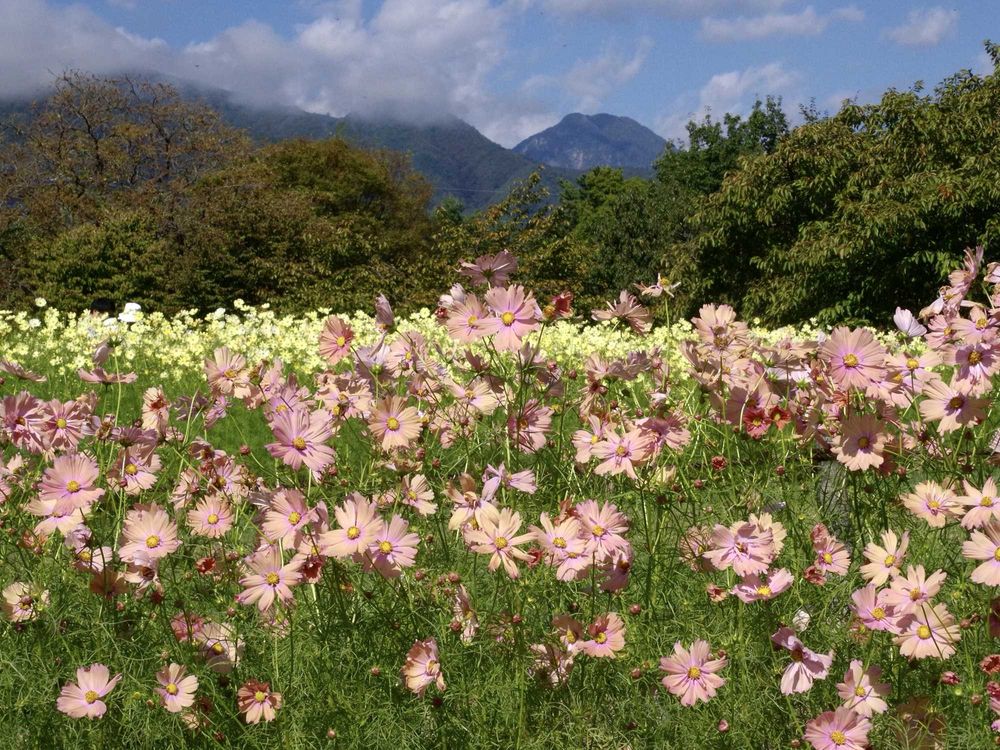 コスモスの見頃にはもう少しだったようですが、背景に木の緑、北アルプスがあり良い景色でした✌️