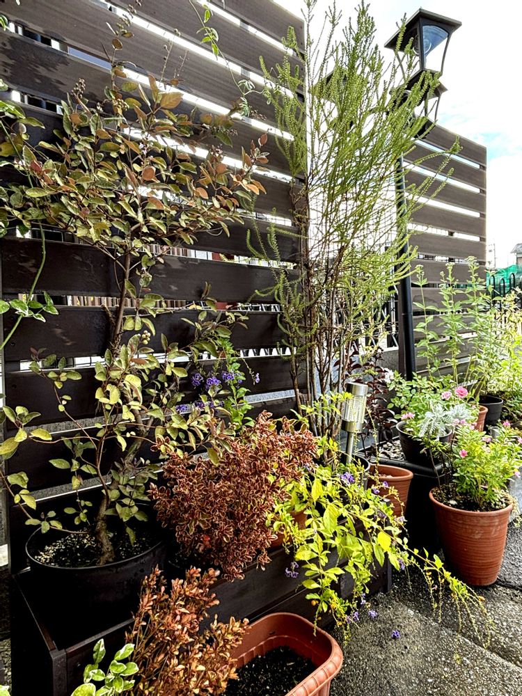 ④道路側のラティスのお花を入れ替えました。3種のフジバカマ🩷🤍🩷が咲きそうなので、表側に出してやりました。アサギマダラ🦋来てくれないかなぁ💖