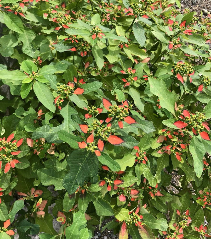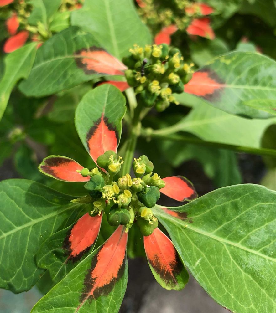初めて見る花と、葉。スマホで調べてみると『サマーポインセチア』という花、葉でした。冬に見かけるポインセチアになんとなく似ていました。😊